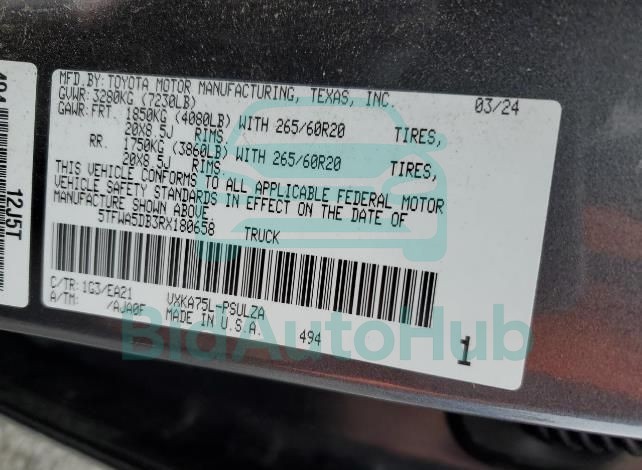 The TOYOTA TUNDRA 2024 - VIN: 5TFWA5DB3RX180658 is equipped with a 3.4l 6 engine. This power unit is known for its efficiency and reliability, and it is part of modern generation of engines designed to balance performance with fuel economy. According to the auction data, the vehicle was registered with only 12464 miles of mileage at the time of sale.
