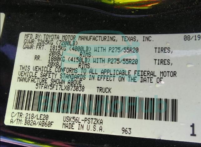 The TOYOTA TUNDRA 4WD 2020 - VIN: 5TFAY5F17LX873038 is equipped with a 5.7l v8 dohc 32v w engine. This power unit is known for its efficiency and reliability, and it is part of modern generation of engines designed to balance performance with fuel economy. According to the auction data, the vehicle was registered with only of mileage at the time of sale.