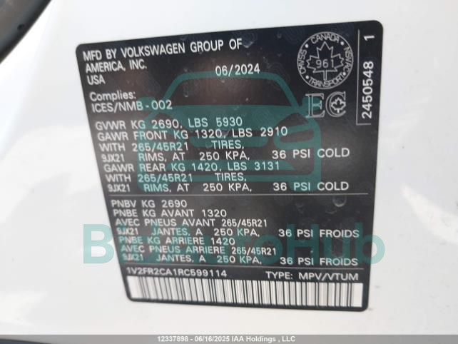This VOLKSWAGEN ATLAS 2024 - VIN: 1V2FR2CA1RC599114 was originally purchased at one of the major insurance auctions in the United States or Canada. The vehicle history is tied directly to its VIN code, which makes it possible to track the origin, condition, and circumstances of the sale. The photographs provided represent the actual state of the car at the moment of auction and serve as an important visual record of its technical and cosmetic condition.