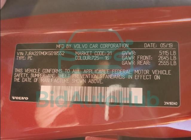Each lot presented on our website includes comprehensive information tied to the VIN code. This allows users to cross-check vehicle data, verify the history of ownership, and confirm accident or insurance records. The VOLVO S60 2019 - VIN: 7JRA22TM0KG018552 corresponds to a car that was listed through one of the large insurance auctions in USA, which guarantees traceability and transparency of the information.
